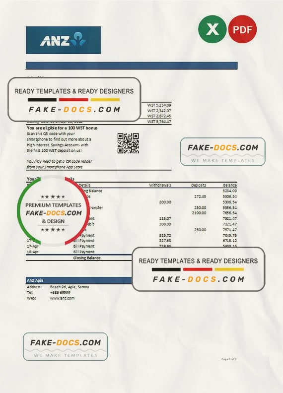 Grab now fully editable Samoa ANZ Bank Statement Excel Template from our website Fake Docs and put your own info to create Fake Bank Statement template Excel and ready your own novelty documents. It’ll be so beneficial if your Bank Statement is expired, stolen or not available. We also have passport psd template, ID Card psd template, Bank Statement psd template, drivers license psd template & Utility bill psd template