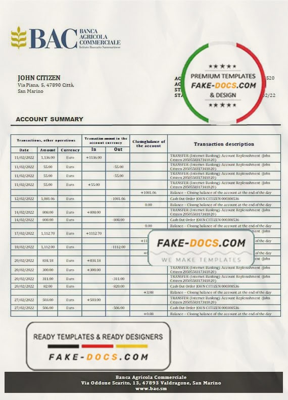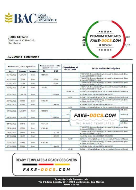 Grab now fully editable San Marino Banca Agricole Commerciale Bank Statement Word Template from our website Fake Docs and put your own info to create Fake Bank Statement Word template and ready your own novelty documents. It’ll be so beneficial if your Bank Statement is expired, stolen or not available. We also have passport psd template, ID Card psd template, Bank Statement psd template, drivers license psd template & Utility bill psd template