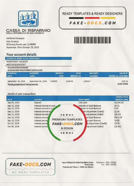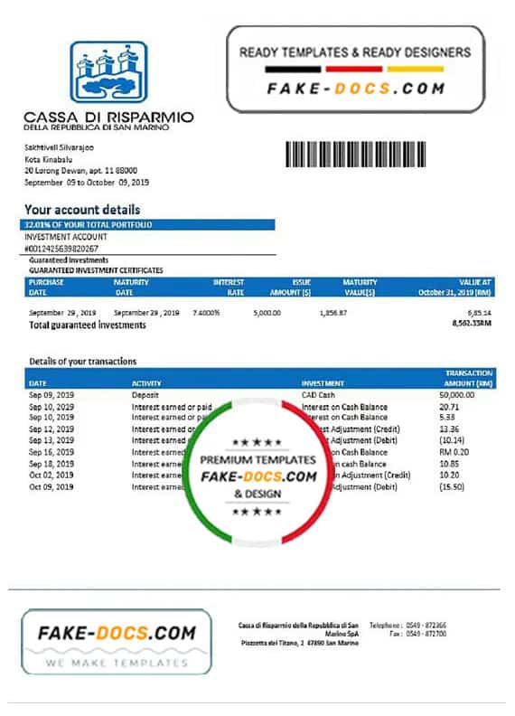 Grab now fully editable San Marino Cassa di Risparmio Bank Statement Word Template from our website Fake Docs and put your own info to create Fake Bank Statement Word template and ready your own novelty documents. It’ll be so beneficial if your Bank Statement is expired, stolen or not available. We also have passport psd template, ID Card psd template, Bank Statement psd template, drivers license psd template & Utility bill psd template