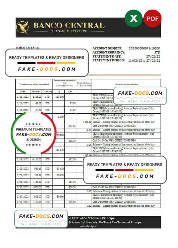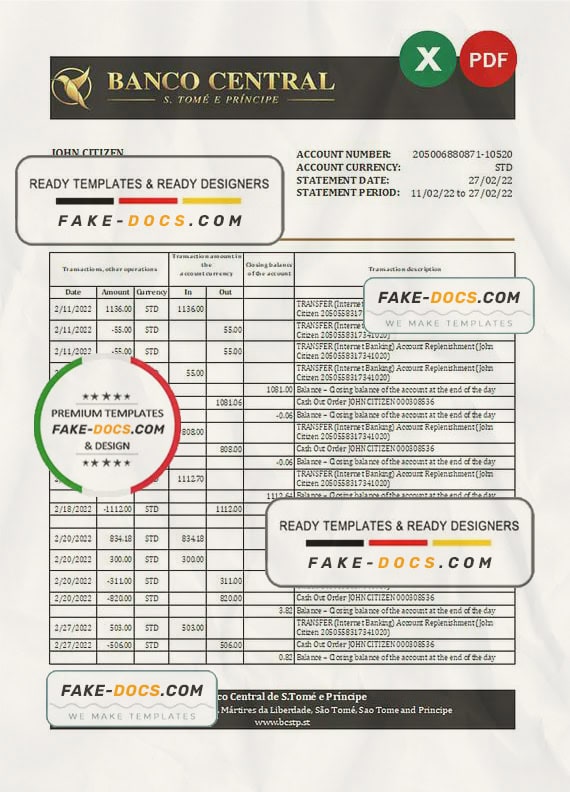 Sao Tome and Principe Banco Central de S.Tome e Principe Bank Statement template Excel. Fully editable Excel template. High quality template. Easy to customize, fonts included. you can edit this template and put any name, address, license number, Id number, birth date, height, weight, expire date, change photos etc. This Excel template is a easy to Editing.To modify this Excel template file you will need a Excel editing software such as Microsoft Excel. Never used low quality template. Your account may be suspended.