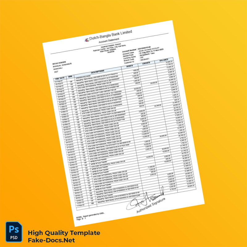Our Saudi Arabia Dutch-Bangla Bank Limited Account Statement Template is designed for individuals who face challenges like document loss or urgent replacements before deadlines. They need a trustworthy resource that can provide exactly what they require in no time. This template addresses core issues such as urgency and professionalism in documentation.