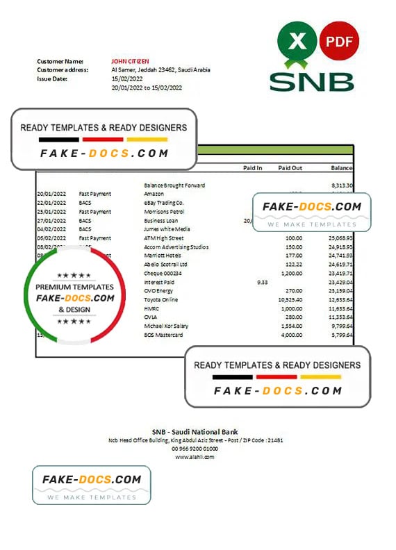 Grab now fully editable Saudi Arabia SNB Bank Statement Excel Template from our website Fake Docs and put your own info to create Fake Bank Statement template Excel and ready your own novelty documents. It’ll be so beneficial if your Bank Statement is expired, stolen or not available. We also have passport psd template, ID Card psd template, Bank Statement psd template, drivers license psd template & Utility bill psd template