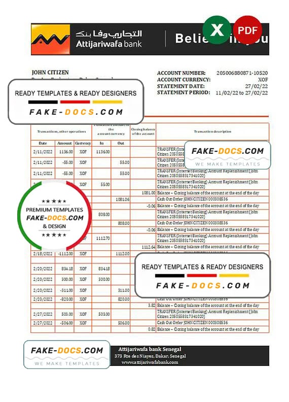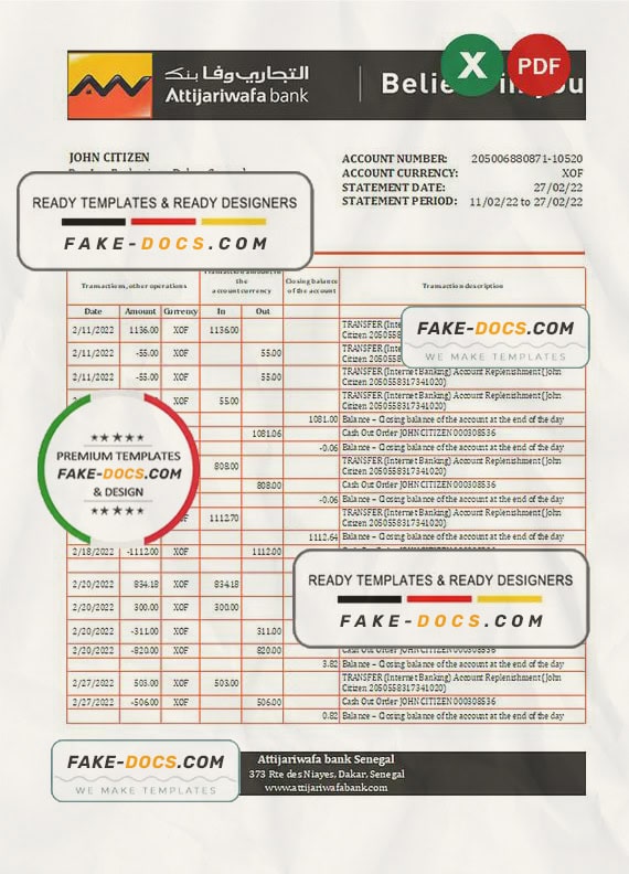 Grab now fully editable Senegal Attijariwafa Bank Statement Excel Template from our website Fake Docs and put your own info to create Fake Bank Statement template Excel and ready your own novelty documents. It’ll be so beneficial if your Bank Statement is expired, stolen or not available. We also have passport psd template, ID Card psd template, Bank Statement psd template, drivers license psd template & Utility bill psd template