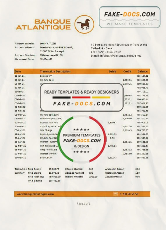 Grab now fully editable Senegal Banque Atlantique Bank Statement Excel Template from our website Fake Docs and put your own info to create Fake Bank Statement template Excel and ready your own novelty documents. It’ll be so beneficial if your Bank Statement is expired, stolen or not available. We also have passport psd template, ID Card psd template, Bank Statement psd template, drivers license psd template & Utility bill psd template