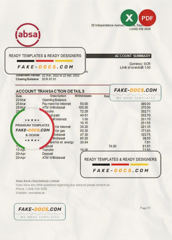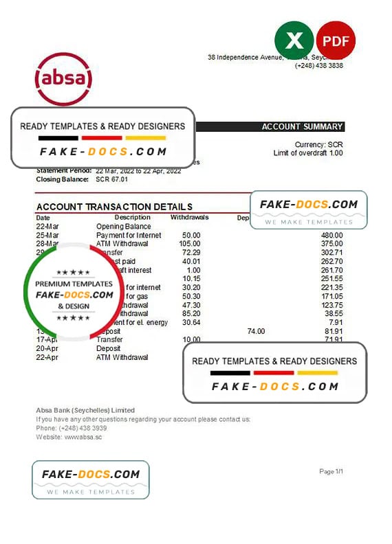 Seychelles ABSA Bank Statement template in Excel an PDF format