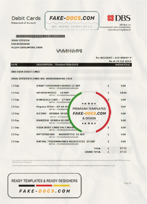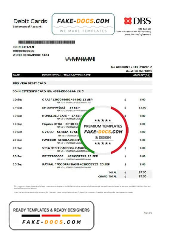 Grab now fully editable Singapore DBS Bank Statement Excel Template from our website Fake Docs and put your own info to create Fake Bank Statement template Excel and ready your own novelty documents. It’ll be so beneficial if your Bank Statement is expired, stolen or not available. We also have passport psd template, ID Card psd template, Bank Statement psd template, drivers license psd template & Utility bill psd template