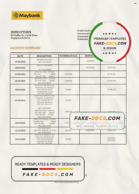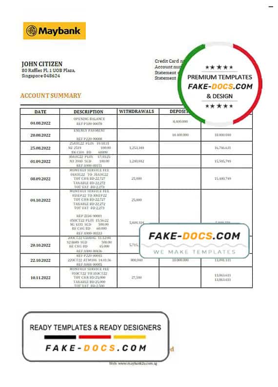 Grab now fully editable Singapore Maybank Bank Statement Word Template from our website Fake Docs and put your own info to create Fake Bank Statement Word template and ready your own novelty documents. It’ll be so beneficial if your Bank Statement is expired, stolen or not available. We also have passport psd template, ID Card psd template, Bank Statement psd template, drivers license psd template & Utility bill psd template