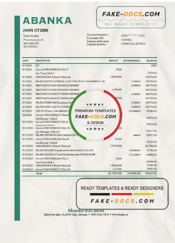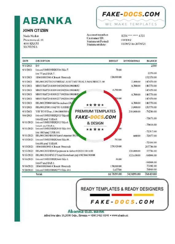 Grab now fully editable Slovenia Abanka d.d Bank Statement Excel Template from our website Fake Docs and put your own info to create Fake Bank Statement template Excel and ready your own novelty documents. It’ll be so beneficial if your Bank Statement is expired, stolen or not available. We also have passport psd template, ID Card psd template, Bank Statement psd template, drivers license psd template & Utility bill psd template