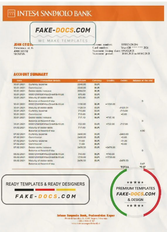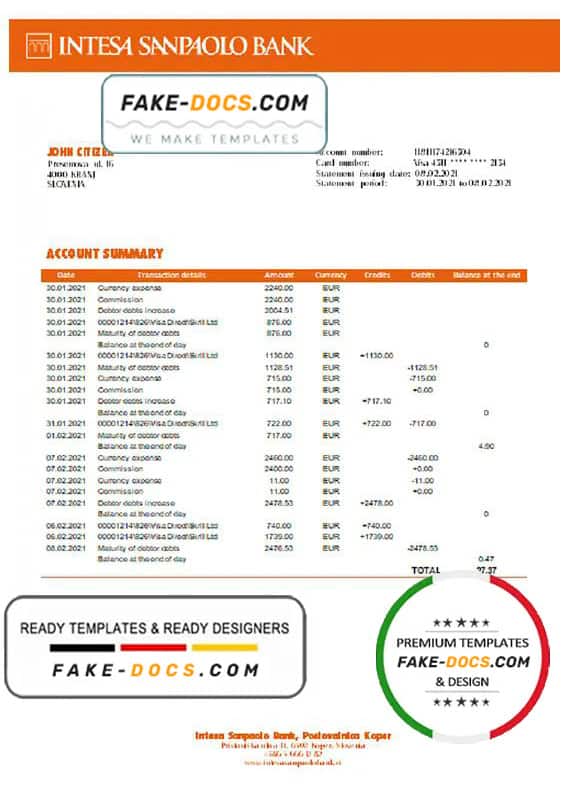 Slovenia Intesa Sanpaolo Bank, Poslovalnica Koper Bank Statement Word template . Fully editable Word template. High quality template. Easy to customize, Layer based, fonts included. you can edit this template and put any name, address, license number, Id number, birth date, height, weight, expire date, change photos etc. This Word template is a easy to Editing.To modify this Word template file you will need a Word editing software such as Microsoft Word. Never used low quality template. Your account may be suspended.