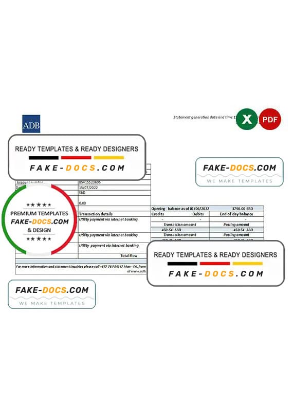 Grab now fully editable Solomon Islands ADB Bank Statement Excel Template from our website Fake Docs and put your own info to create Fake Bank Statement template Excel and ready your own novelty documents. It’ll be so beneficial if your Bank Statement is expired, stolen or not available. We also have passport psd template, ID Card psd template, Bank Statement psd template, drivers license psd template & Utility bill psd template