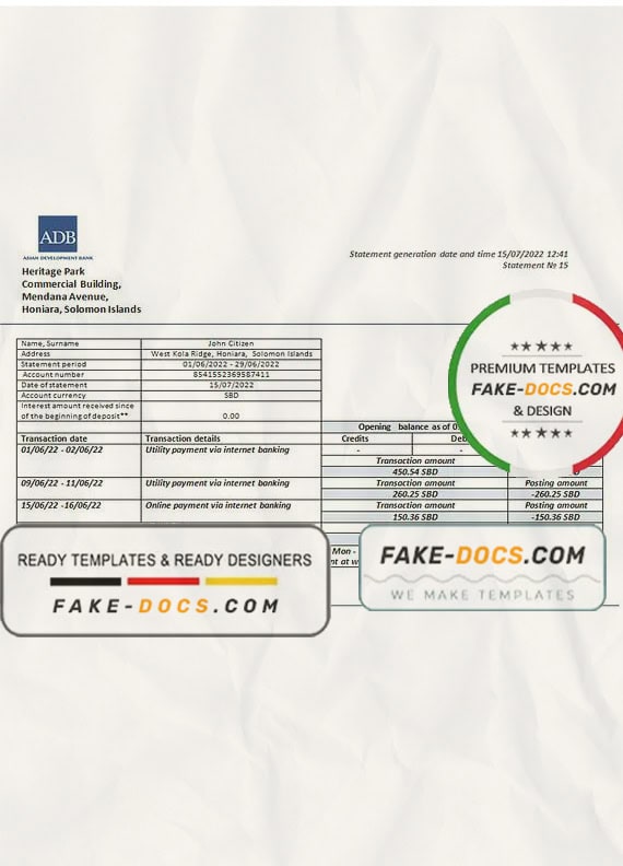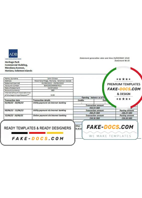 Grab now fully editable Solomon Islands ADB Bank Statement Word Template from our website Fake Docs and put your own info to create Fake Bank Statement Word template and ready your own novelty documents. It’ll be so beneficial if your Bank Statement is expired, stolen or not available. We also have passport psd template, ID Card psd template, Bank Statement psd template, drivers license psd template & Utility bill psd template