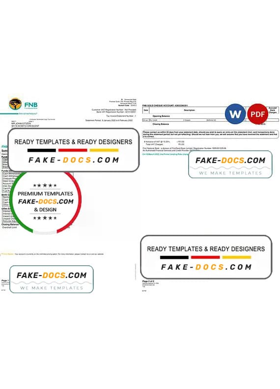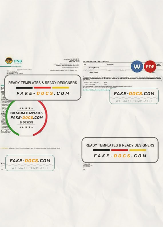 South Africa First National Bank (FNB) Bank Statement Word template . Fully editable Word  template. High quality template. Easy to customize, Layer based, fonts included. you can edit this template and  put any name, address, license number, Id number, birth date, height, weight, expire date, change photos etc. This Word  template is a easy to Editing.To modify this Word template file you will need a Word editing software such as Microsoft Word. Never used low quality template. Your account may be suspended.