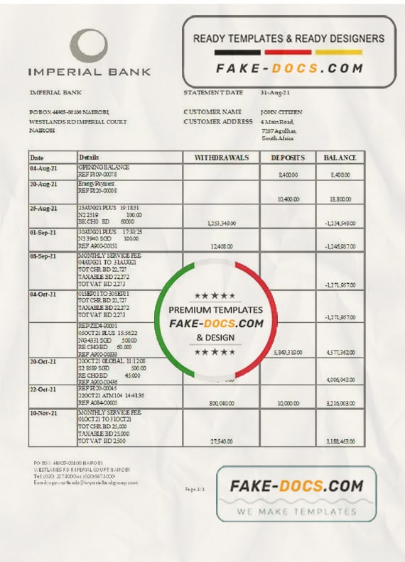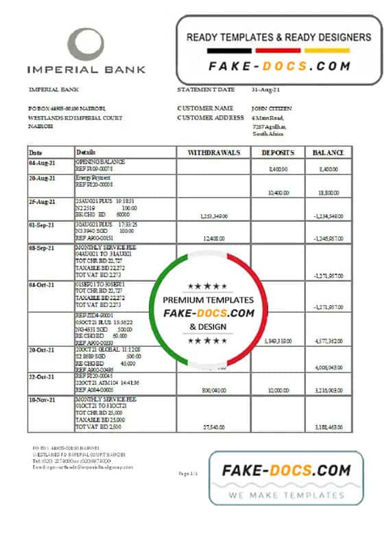 Grab now fully editable South Africa Imperial Bank Statement Excel Template from our website Fake Docs and put your own info to create Fake Bank Statement template Excel and ready your own novelty documents. It’ll be so beneficial if your Bank Statement is expired, stolen or not available. We also have passport psd template, ID Card psd template, Bank Statement psd template, drivers license psd template & Utility bill psd template