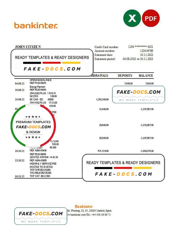 Grab now fully editable Spain Bankinter Bank Statement Excel Template from our website Fake Docs and put your own info to create Fake Bank Statement template Excel and ready your own novelty documents. It’ll be so beneficial if your Bank Statement is expired, stolen or not available. We also have passport psd template, ID Card psd template, Bank Statement psd template, drivers license psd template & Utility bill psd template