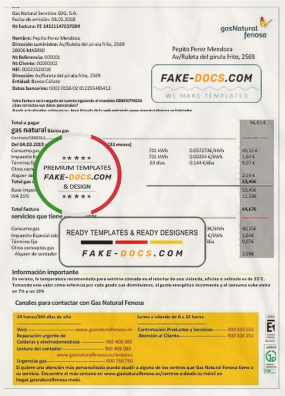 Grab now fully editable Spain gasNatural fenosa utility bill Template from our website fake docs and put your own info to create a fake copy of Fake Spain gasNatural fenosa Utility Bill for proof of address and ready your own novelty documents. It’ll be so beneficial if your utility bill is expired, stolen or not available. We also have passport psd template, ID Card psd template, Bank Statement psd template, drivers license psd template & Utility bill psd template