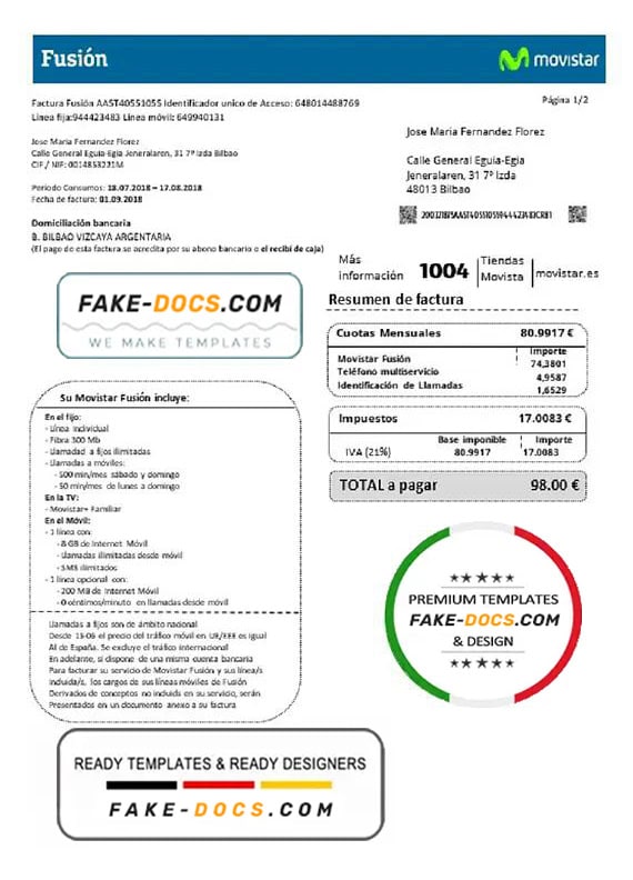Grab now fully editable Spain Movistar Fusion telecom operator utility bill Template from our website fake docs and put your own info to create a fake copy of Fake Spain Movistar Fusion telecom operator Utility Bill for proof of address and ready your own novelty documents. It’ll be so beneficial if your utility bill is expired, stolen or not available. We also have passport psd template, ID Card psd template, Bank Statement psd template, drivers license psd template & Utility bill psd template