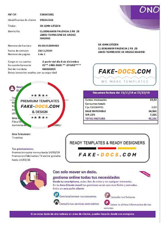 Grab now fully editable Spain ONO easy fillable utility bill Template from our website fake docs and put your own info to create a fake copy of Fake Spain ONO easy fillable Utility Bill for proof of address and ready your own novelty documents. It’ll be so beneficial if your utility bill is expired, stolen or not available. We also have passport psd template, ID Card psd template, Bank Statement psd template, drivers license psd template & Utility bill psd template