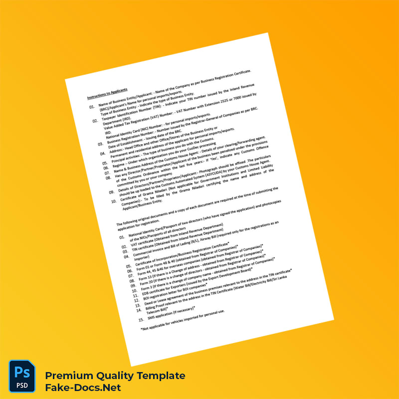 The Sri Lanka Customs Importers and Exporters Registration Form Template (Word & PDF) is a meticulously crafted, editable registration certificate designed for professionals seeking a quick and reliable solution to official document management. This comprehensive certificate template simplifies the registration process, enabling seamless customization to meet specific business requirements. Ideal for entrepreneurs, importers, and exporters aiming to maintain compliance effortlessly.