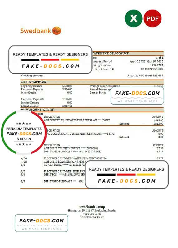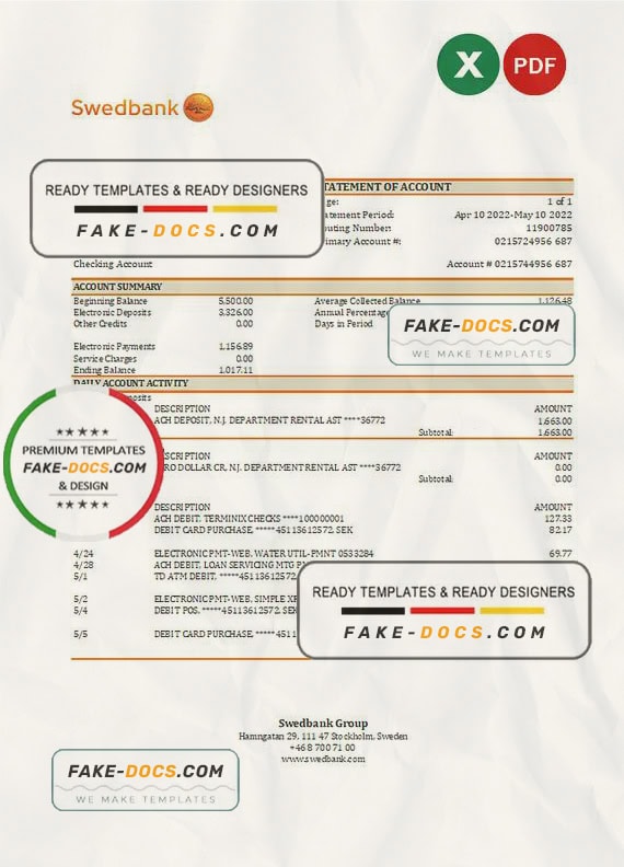 Sweden Swedbank Bank Statement template Excel. Fully editable Excel template. High quality template. Easy to customize, fonts included. you can edit this template and  put any name, address, license number, Id number, birth date, height, weight, expire date, change photos etc. This Excel template is a easy to Editing.To modify this Excel template file you will need a Excel editing software such as Microsoft Excel. Never used low quality template. Your account may be suspended.
