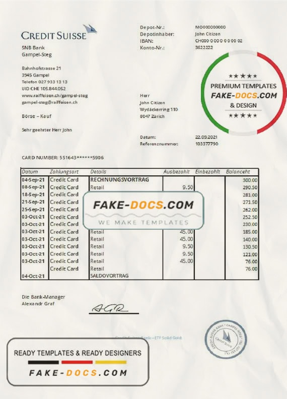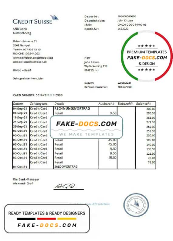 Grab now fully editable Switzerland Credit Suisse Bank Statement Word Template from our website Fake Docs and put your own info to create Fake Bank Statement Word template and ready your own novelty documents. It’ll be so beneficial if your Bank Statement is expired, stolen or not available. We also have passport psd template, ID Card psd template, Bank Statement psd template, drivers license psd template & Utility bill psd template