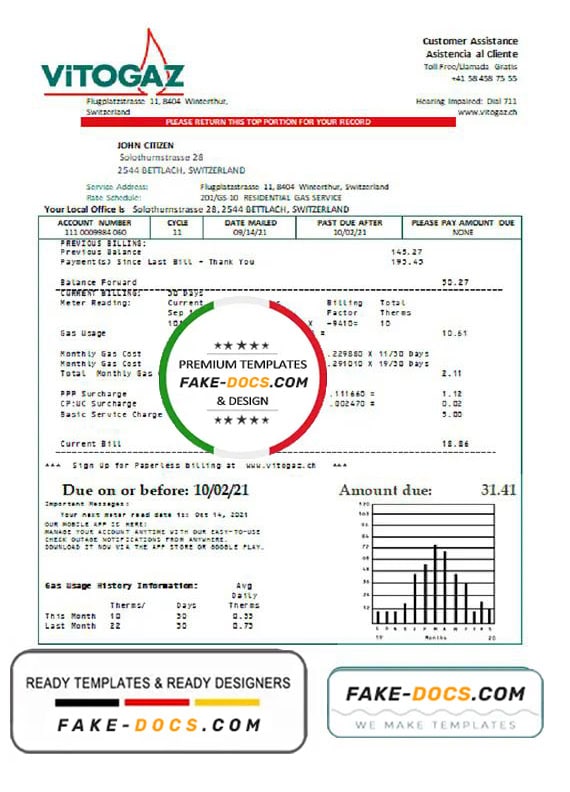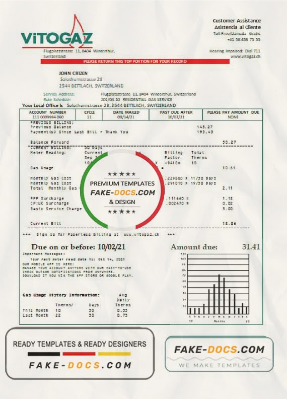 Grab now fully editable Switzerland Vitogaz Switzerland AG utility bill Template from our website fake docs and put your own info to create a fake copy of Fake Switzerland Vitogaz Switzerland AG Utility Bill for proof of address and ready your own novelty documents. It’ll be so beneficial if your utility bill is expired, stolen or not available. We also have passport psd template, ID Card psd template, Bank Statement psd template, drivers license psd template & Utility bill psd template