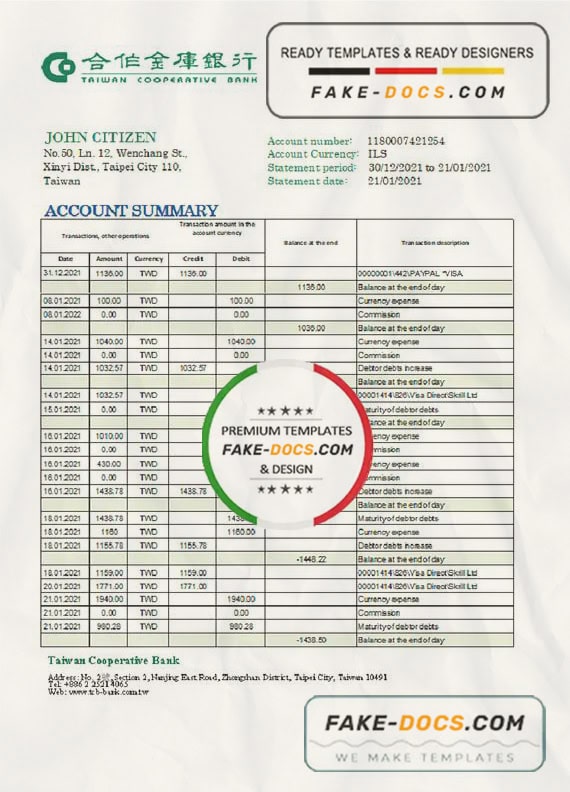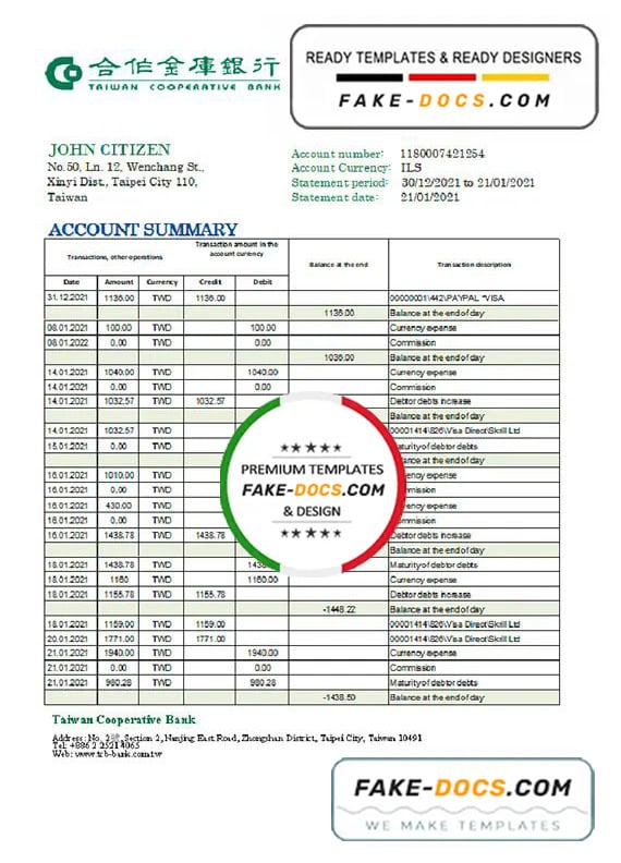 Grab now fully editable Taiwan Cooperative Bank Statement Excel Template from our website Fake Docs and put your own info to create Fake Bank Statement template Excel and ready your own novelty documents. It’ll be so beneficial if your Bank Statement is expired, stolen or not available. We also have passport psd template, ID Card psd template, Bank Statement psd template, drivers license psd template & Utility bill psd template