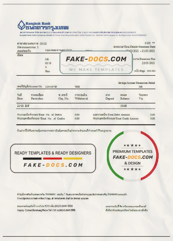 Grab now fully editable Thailand Bangkok Bank Statement Word Template from our website Fake Docs and put your own info to create Fake Bank Statement Word template and ready your own novelty documents. It’ll be so beneficial if your Bank Statement is expired, stolen or not available. We also have passport psd template, ID Card psd template, Bank Statement psd template, drivers license psd template & Utility bill psd template