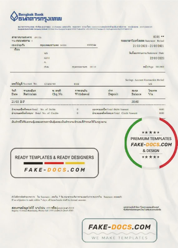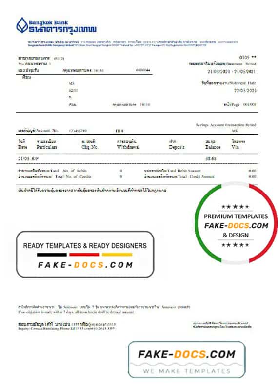 Grab now fully editable Thailand Bangkok Bank Statement Word Template from our website Fake Docs and put your own info to create Fake Bank Statement Word template and ready your own novelty documents. It’ll be so beneficial if your Bank Statement is expired, stolen or not available. We also have passport psd template, ID Card psd template, Bank Statement psd template, drivers license psd template & Utility bill psd template