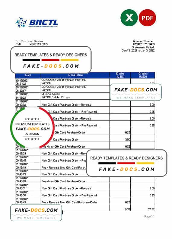Grab now fully editable Timor-Leste BNCTL Bank Statement Excel Template from our website Fake Docs and put your own info to create Fake Bank Statement template Excel and ready your own novelty documents. It’ll be so beneficial if your Bank Statement is expired, stolen or not available. We also have passport psd template, ID Card psd template, Bank Statement psd template, drivers license psd template & Utility bill psd template