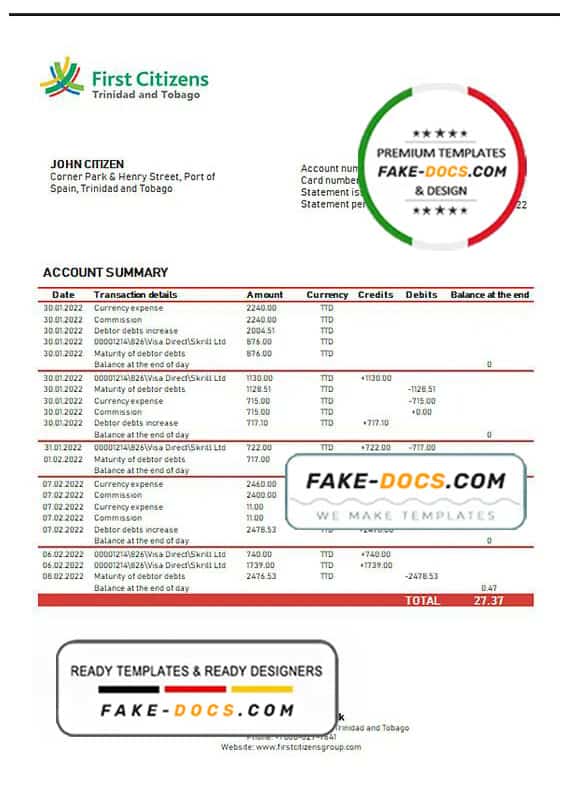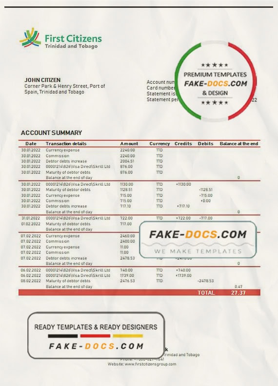 Grab now fully editable Trinidad and Tobago First Citizens Bank Statement Word Template from our website Fake Docs and put your own info to create Fake Bank Statement Word template and ready your own novelty documents. It’ll be so beneficial if your Bank Statement is expired, stolen or not available. We also have passport psd template, ID Card psd template, Bank Statement psd template, drivers license psd template & Utility bill psd template
