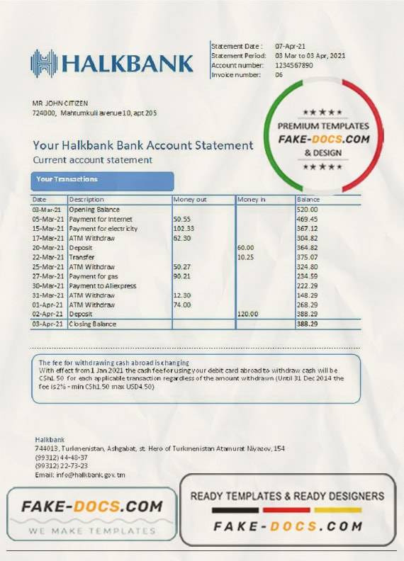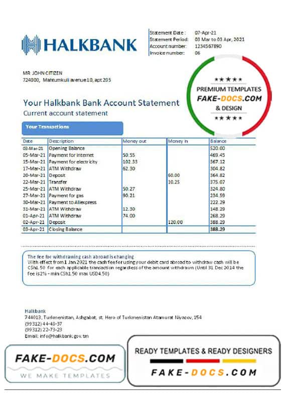 Grab now fully editable Turkmenistan Halkbank Bank Statement Excel Template from our website Fake Docs and put your own info to create Fake Bank Statement template Excel and ready your own novelty documents. It’ll be so beneficial if your Bank Statement is expired, stolen or not available. We also have passport psd template, ID Card psd template, Bank Statement psd template, drivers license psd template & Utility bill psd template