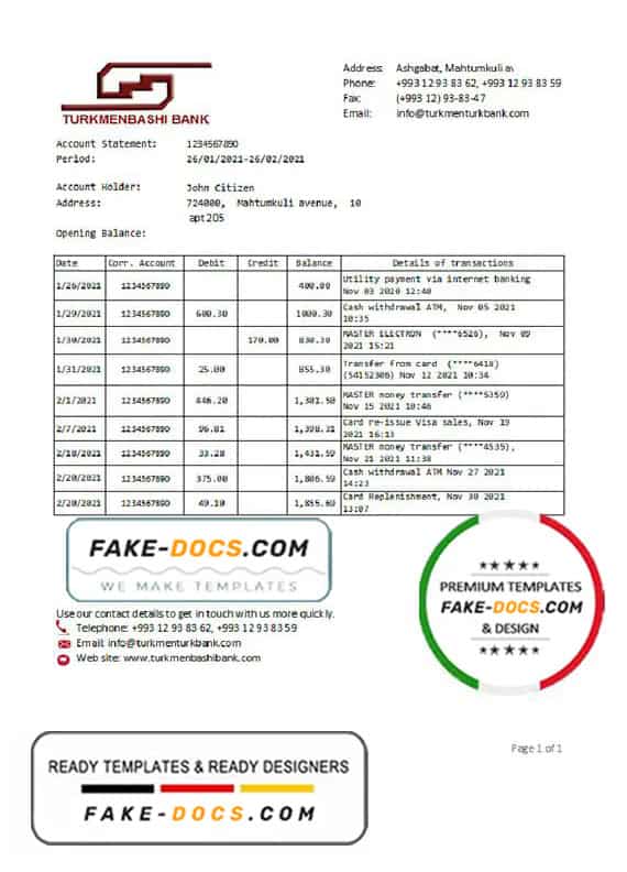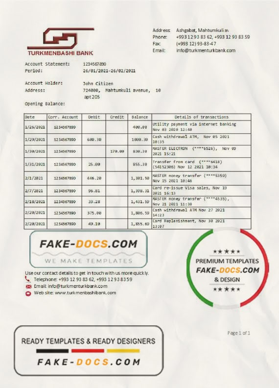 Grab now fully editable Turkmenistan Turkmenbashi Bank Statement Excel Template from our website Fake Docs and put your own info to create Fake Bank Statement template Excel and ready your own novelty documents. It’ll be so beneficial if your Bank Statement is expired, stolen or not available. We also have passport psd template, ID Card psd template, Bank Statement psd template, drivers license psd template & Utility bill psd template