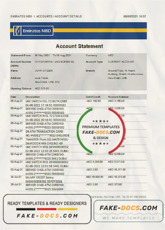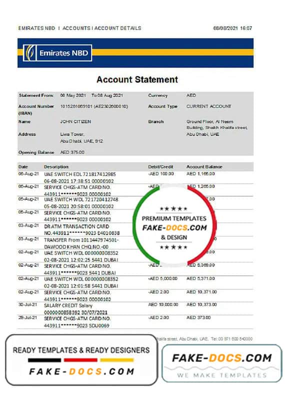 Grab now fully editable UAE Abu Dhabi NBD Bank Statement Excel Template from our website Fake Docs and put your own info to create Fake Bank Statement template Excel and ready your own novelty documents. It’ll be so beneficial if your Bank Statement is expired, stolen or not available. We also have passport psd template, ID Card psd template, Bank Statement psd template, drivers license psd template & Utility bill psd template