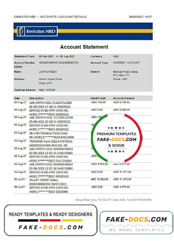 Grab now fully editable UAE Dubai Emirates NBD Bank Statement Excel Template from our website Fake Docs and put your own info to create Fake Bank Statement template Excel and ready your own novelty documents. It’ll be so beneficial if your Bank Statement is expired, stolen or not available. We also have passport psd template, ID Card psd template, Bank Statement psd template, drivers license psd template & Utility bill psd template