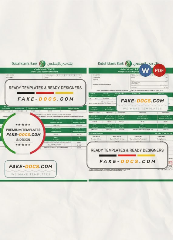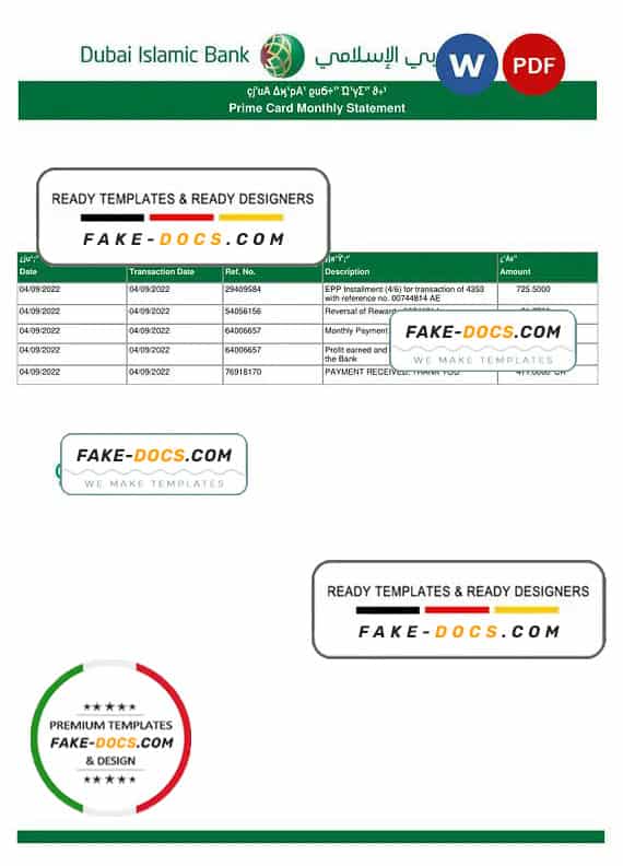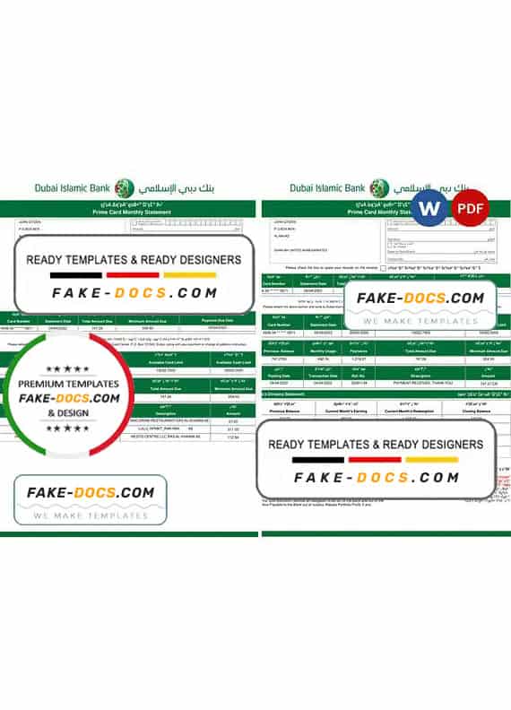 UAE Dubai Islamic Bank Statement Word template . Fully editable Word  template. High quality template. Easy to customize, Layer based, fonts included. you can edit this template and  put any name, address, license number, Id number, birth date, height, weight, expire date, change photos etc. This Word  template is a easy to Editing.To modify this Word template file you will need a Word editing software such as Microsoft Word. Never used low quality template. Your account may be suspended.