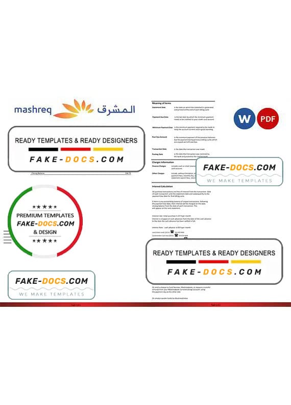 UAE Mashreq Bank Statement Word template . Fully editable Word  template. High quality template. Easy to customize, Layer based, fonts included. you can edit this template and  put any name, address, license number, Id number, birth date, height, weight, expire date, change photos etc. This Word  template is a easy to Editing.To modify this Word template file you will need a Word editing software such as Microsoft Word. Never used low quality template. Your account may be suspended.