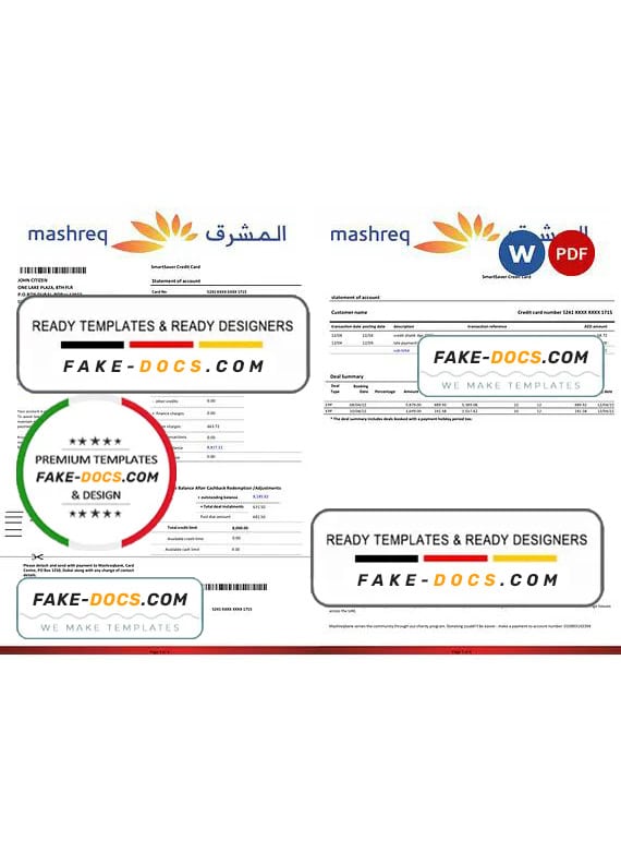 Grab now fully editable UAE Mashreq Bank Statement Word Template from our website Fake Docs and put your own info to create Fake Bank Statement Word template and ready your own novelty documents. It’ll be so beneficial if your Bank Statement is expired, stolen or not available. We also have passport psd template, ID Card psd template, Bank Statement psd template, drivers license psd template & Utility bill psd template