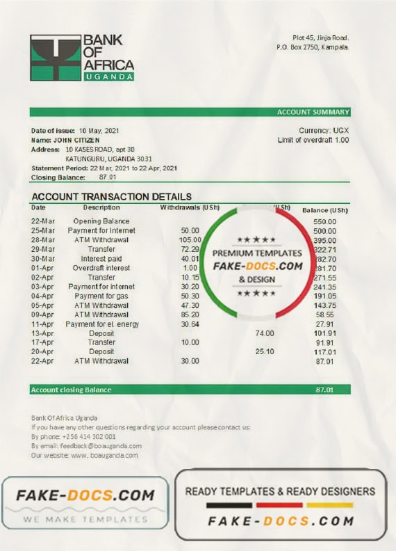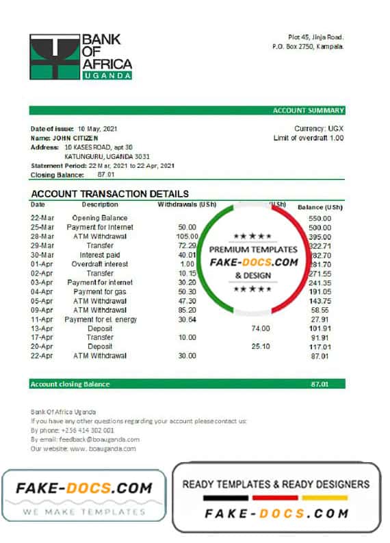Grab now fully editable Uganda Bank of Africa Bank Statement Excel Template from our website Fake Docs and put your own info to create Fake Bank Statement template Excel and ready your own novelty documents. It’ll be so beneficial if your Bank Statement is expired, stolen or not available. We also have passport psd template, ID Card psd template, Bank Statement psd template, drivers license psd template & Utility bill psd template