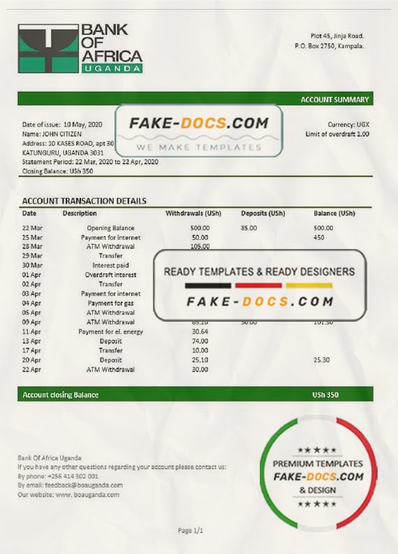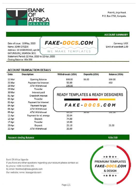 Grab now fully editable Uganda Bank of Africa proof of address Bank Statement Word Template from our website Fake Docs and put your own info to create Fake Bank Statement Word template and ready your own novelty documents. It’ll be so beneficial if your Bank Statement is expired, stolen or not available. We also have passport psd template, ID Card psd template, Bank Statement psd template, drivers license psd template & Utility bill psd template