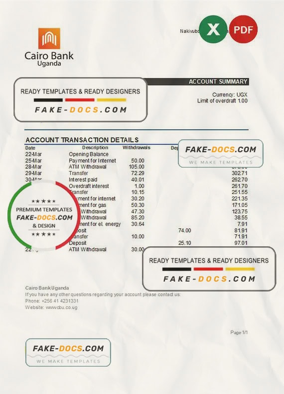 Grab now fully editable Uganda Cairo Bank Statement Excel Template from our website Fake Docs and put your own info to create Fake Bank Statement template Excel and ready your own novelty documents. It’ll be so beneficial if your Bank Statement is expired, stolen or not available. We also have passport psd template, ID Card psd template, Bank Statement psd template, drivers license psd template & Utility bill psd template