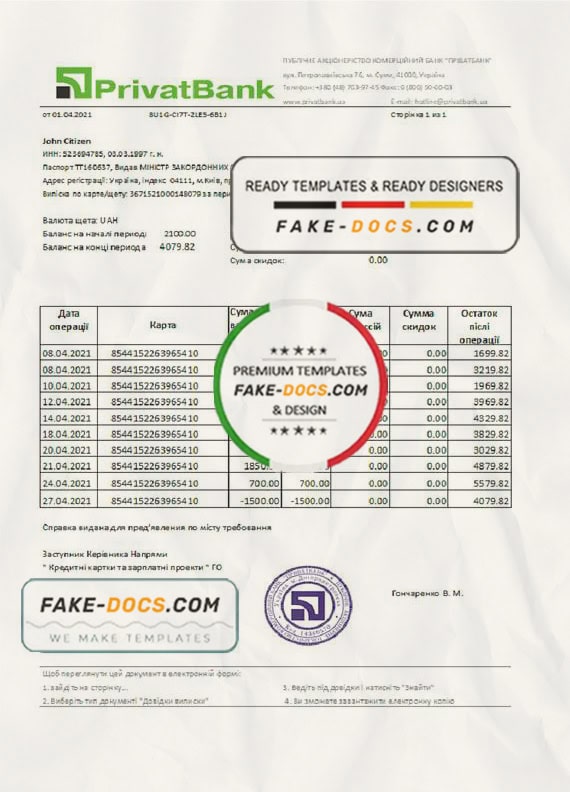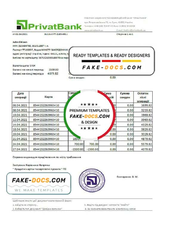 Grab now fully editable Ukraine PrivatBank Bank Statement Excel Template from our website Fake Docs and put your own info to create Fake Bank Statement template Excel and ready your own novelty documents. It’ll be so beneficial if your Bank Statement is expired, stolen or not available. We also have passport psd template, ID Card psd template, Bank Statement psd template, drivers license psd template & Utility bill psd template