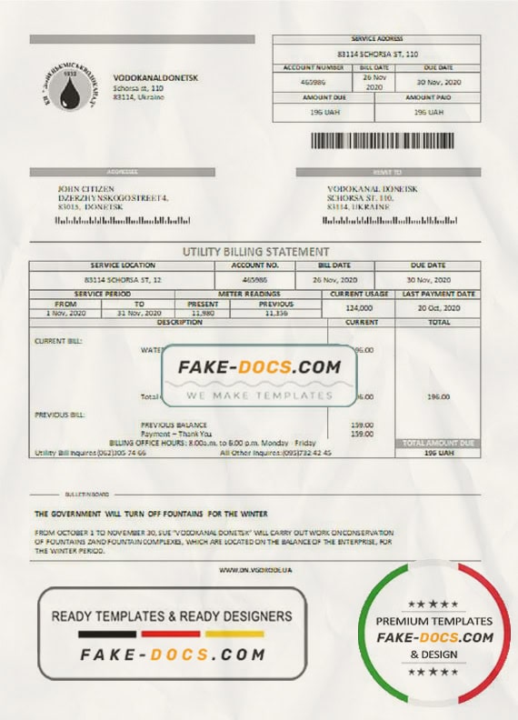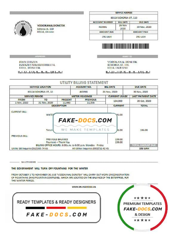Grab now fully editable Ukraine Vodokanal Donetsk (Донецькмиськводоканал) utility bill Template from our website fake docs and put your own info to create a fake copy of Fake Ukraine Vodokanal Donetsk (Донецькмиськводоканал) Utility Bill for proof of address and ready your own novelty documents. It’ll be so beneficial if your utility bill is expired, stolen or not available. We also have passport psd template, ID Card psd template, Bank Statement psd template, drivers license psd template & Utility bill psd template