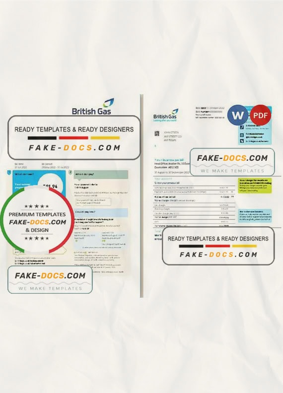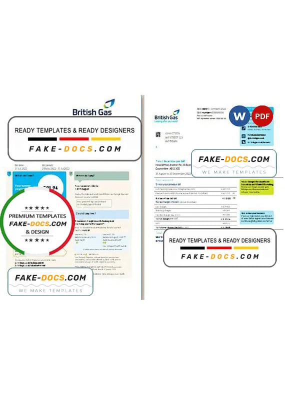 United Kingdom British Gas utility bill Word template . Fully editable Word template. High quality template. Easy to customize, Layer based, fonts included. you can edit this template and put any name, address, license number, Id number, birth date, height, weight, expire date etc. This Word template is a easy to Editing.To modify this Word template file you will need a Word editing software such as Microsoft Word. Never used low quality template. Your account may be suspended.