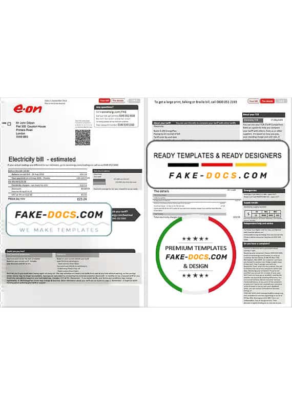 Grab now fully editable United Kingdom E.ON electricity utility bill Template from our website fake docs and put your own info to create a fake copy of Fake United Kingdom E.ON electricity Utility Bill for proof of address and ready your own novelty documents. It’ll be so beneficial if your utility bill is expired, stolen or not available. We also have passport psd template, ID Card psd template, Bank Statement psd template, drivers license psd template & Utility bill psd template