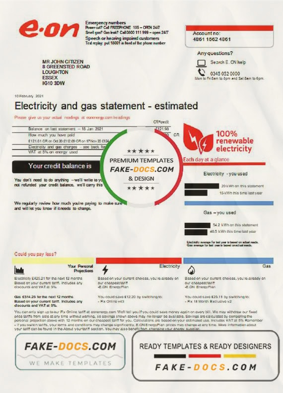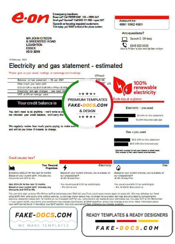 United Kingdom E.ON utility bill Word and Pdf Template use for :