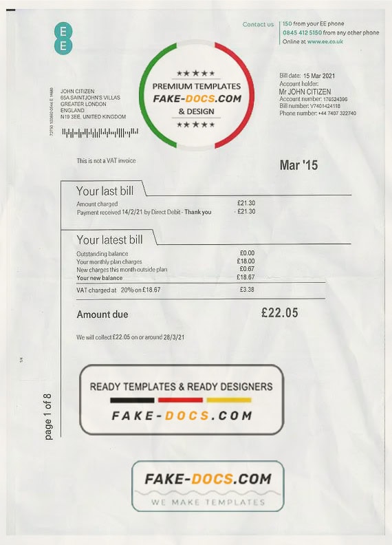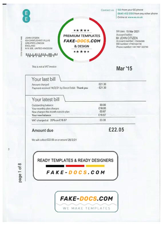 Grab now fully editable United Kingdom EE phone Utility Bill psd template from our website fake docs and put your own info to create a fake copy of Fake United Kingdom EE phone Utility Bill for proof of address and ready your own novelty documents. It’ll be so beneficial if your ID Card is expired, stolen or not available. We also have passport psd template, ID Card psd template, Bank Statement psd template, drivers license psd template & utility bill psd template