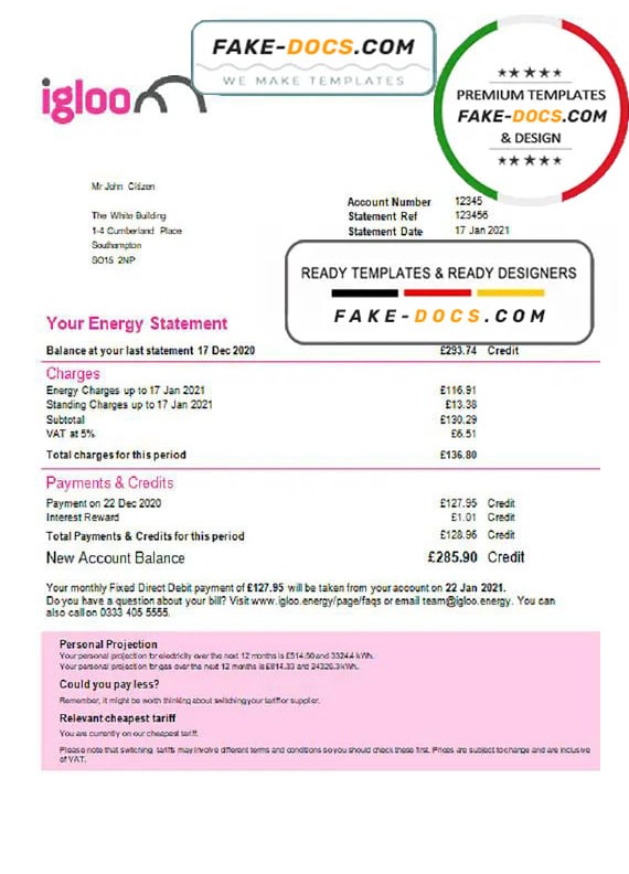 Grab now fully editable United Kingdom Igloo Energy utility bill Template from our website fake docs and put your own info to create a fake copy of Fake United Kingdom Igloo Energy Utility Bill for proof of address and ready your own novelty documents. It’ll be so beneficial if your utility bill is expired, stolen or not available. We also have passport psd template, ID Card psd template, Bank Statement psd template, drivers license psd template & Utility bill psd template