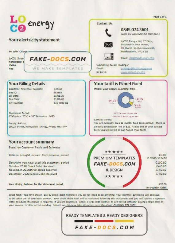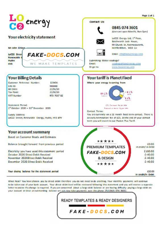 Grab now fully editable United Kingdom LoCO2 Energy utility bill Template from our website fake docs and put your own info to create a fake copy of Fake United Kingdom LoCO2 Energy Utility Bill for proof of address and ready your own novelty documents. It’ll be so beneficial if your utility bill is expired, stolen or not available. We also have passport psd template, ID Card psd template, Bank Statement psd template, drivers license psd template & Utility bill psd template