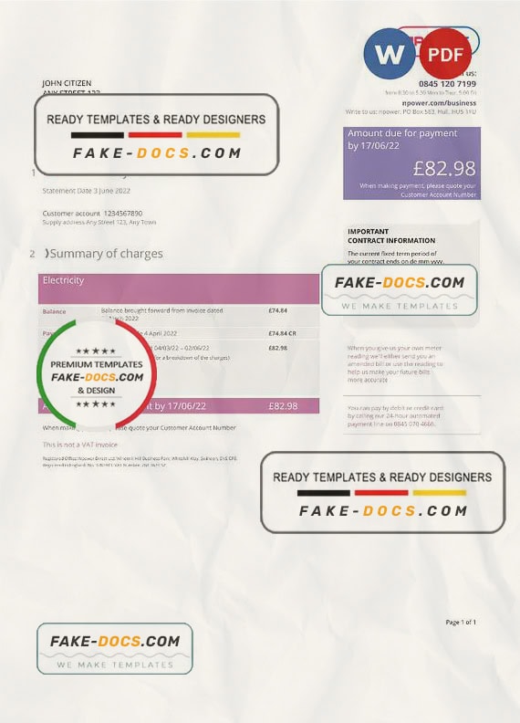 United Kingdom Npower utility bill Word template . Fully editable Word template. High quality template. Easy to customize, Layer based, fonts included. you can edit this template and put any name, address, license number, Id number, birth date, height, weight, expire date etc. This Word template is a easy to Editing.To modify this Word template file you will need a Word editing software such as Microsoft Word. Never used low quality template. Your account may be suspended.