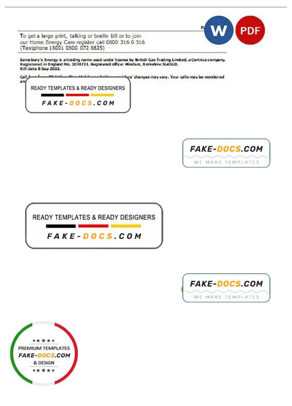 United Kingdom Sainsbury’s Energy (British Gas) utility bill Word template . Fully editable Word template. High quality template. Easy to customize, Layer based, fonts included. you can edit this template and put any name, address, license number, Id number, birth date, height, weight, expire date etc. This Word template is a easy to Editing.To modify this Word template file you will need a Word editing software such as Microsoft Word. Never used low quality template. Your account may be suspended.